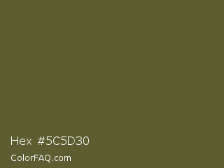 Hex #5c5d30 Color is a dark yellow color and the nearest color is Costa Del Sol #615d30. Hex code #5c5d30 and RGB value is rgb(92,93,48). In RGB color space, this color is composed of 36% red, 36% green, 19% blue, In CMYK color space, this color is composed of 1% cyan, 0% magenta, 48% yellow , 64% black , In HSL color space, this color has a hue angle of 61° , 32% saturation and 28% lightness.