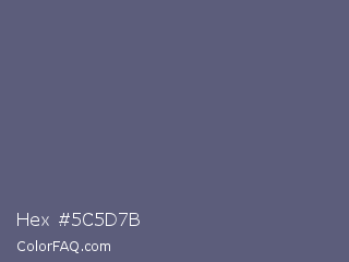 Hex #5c5d7b Color is a normal blue color and the nearest color is Comet #5c5d75. Hex code #5c5d7b and RGB value is rgb(92,93,123). In RGB color space, this color is composed of 36% red, 36% green, 48% blue, In CMYK color space, this color is composed of 25% cyan, 24% magenta, 0% yellow , 52% black , In HSL color space, this color has a hue angle of 238° , 14% saturation and 42% lightness.