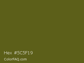 Hex #5c5f19 Color is a dark yellow color and the nearest color is Antique Bronze #665d1e. Hex code #5c5f19 and RGB value is rgb(92,95,25). In RGB color space, this color is composed of 36% red, 37% green, 10% blue, In CMYK color space, this color is composed of 3% cyan, 0% magenta, 74% yellow , 63% black , In HSL color space, this color has a hue angle of 63° , 58% saturation and 24% lightness.