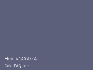 Hex #5c607a Color is a normal blue color and the nearest color is Comet #5c5d75. Hex code #5c607a and RGB value is rgb(92,96,122). In RGB color space, this color is composed of 36% red, 38% green, 48% blue, In CMYK color space, this color is composed of 25% cyan, 21% magenta, 0% yellow , 52% black , In HSL color space, this color has a hue angle of 232° , 14% saturation and 42% lightness.