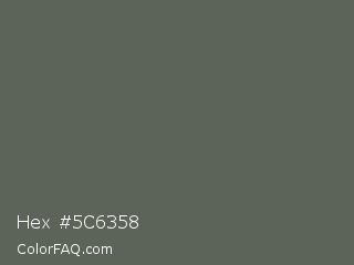 Hex #5c6358 Color is a normal green color and the nearest color is Chicago #5d5c58. Hex code #5c6358 and RGB value is rgb(92,99,88). In RGB color space, this color is composed of 36% red, 39% green, 35% blue, In CMYK color space, this color is composed of 7% cyan, 0% magenta, 11% yellow , 61% black , In HSL color space, this color has a hue angle of 98° , 6% saturation and 37% lightness.