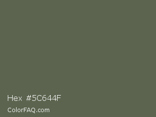 Hex #5c644f Color is a normal green color and the nearest color is Finch #626649. Hex code #5c644f and RGB value is rgb(92,100,79). In RGB color space, this color is composed of 36% red, 39% green, 31% blue, In CMYK color space, this color is composed of 8% cyan, 0% magenta, 21% yellow , 61% black , In HSL color space, this color has a hue angle of 83° , 12% saturation and 35% lightness.