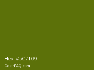 Hex #5c7109 Color is a dark lime color and the nearest color is Avocado #568203. Hex code #5c7109 and RGB value is rgb(92,113,9). In RGB color space, this color is composed of 36% red, 44% green, 4% blue, In CMYK color space, this color is composed of 19% cyan, 0% magenta, 92% yellow , 56% black , In HSL color space, this color has a hue angle of 72° , 85% saturation and 24% lightness.
