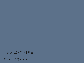 Hex #5c718a Color is a normal blue color and the nearest color is UCLA Blue #536895. Hex code #5c718a and RGB value is rgb(92,113,138). In RGB color space, this color is composed of 36% red, 44% green, 54% blue, In CMYK color space, this color is composed of 33% cyan, 18% magenta, 0% yellow , 46% black , In HSL color space, this color has a hue angle of 213° , 20% saturation and 45% lightness.