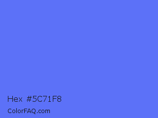 Hex #5c71f8 Color is a light blue color and the nearest color is Very Light Blue #6666ff. Hex code #5c71f8 and RGB value is rgb(92,113,248). In RGB color space, this color is composed of 36% red, 44% green, 97% blue, In CMYK color space, this color is composed of 63% cyan, 54% magenta, 0% yellow , 3% black , In HSL color space, this color has a hue angle of 232° , 92% saturation and 67% lightness.