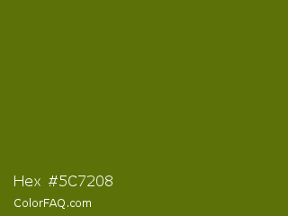 Hex #5c7208 Color is a dark lime color and the nearest color is Avocado #568203. Hex code #5c7208 and RGB value is rgb(92,114,8). In RGB color space, this color is composed of 36% red, 45% green, 3% blue, In CMYK color space, this color is composed of 19% cyan, 0% magenta, 93% yellow , 55% black , In HSL color space, this color has a hue angle of 72° , 87% saturation and 24% lightness.