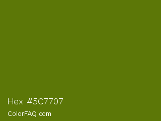 Hex #5c7707 Color is a dark lime color and the nearest color is Avocado #568203. Hex code #5c7707 and RGB value is rgb(92,119,7). In RGB color space, this color is composed of 36% red, 47% green, 3% blue, In CMYK color space, this color is composed of 23% cyan, 0% magenta, 94% yellow , 53% black , In HSL color space, this color has a hue angle of 74° , 89% saturation and 25% lightness.