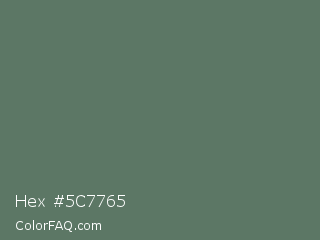 Hex #5c7765 Color is a normal green color and the nearest color is Corduroy #606e68. Hex code #5c7765 and RGB value is rgb(92,119,101). In RGB color space, this color is composed of 36% red, 47% green, 40% blue, In CMYK color space, this color is composed of 23% cyan, 0% magenta, 15% yellow , 53% black , In HSL color space, this color has a hue angle of 140° , 13% saturation and 41% lightness.