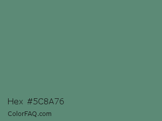 Hex #5c8a76 Color is a normal green color and the nearest color is Wintergreen Dream #56887d. Hex code #5c8a76 and RGB value is rgb(92,138,118). In RGB color space, this color is composed of 36% red, 54% green, 46% blue, In CMYK color space, this color is composed of 33% cyan, 0% magenta, 14% yellow , 46% black , In HSL color space, this color has a hue angle of 154° , 20% saturation and 45% lightness.