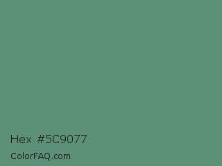 Hex #5c9077 Color is a normal green color and the nearest color is Wintergreen Dream #56887d. Hex code #5c9077 and RGB value is rgb(92,144,119). In RGB color space, this color is composed of 36% red, 56% green, 47% blue, In CMYK color space, this color is composed of 36% cyan, 0% magenta, 17% yellow , 44% black , In HSL color space, this color has a hue angle of 151° , 22% saturation and 46% lightness.