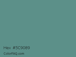 Hex #5c9089 Color is a normal cyan color and the nearest color is Steel Teal #5f8a8b. Hex code #5c9089 and RGB value is rgb(92,144,137). In RGB color space, this color is composed of 36% red, 56% green, 54% blue, In CMYK color space, this color is composed of 36% cyan, 0% magenta, 5% yellow , 44% black , In HSL color space, this color has a hue angle of 172° , 22% saturation and 46% lightness.
