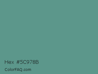Hex #5c978b Color is a normal cyan color and the nearest color is Patina #639a8f. Hex code #5c978b and RGB value is rgb(92,151,139). In RGB color space, this color is composed of 36% red, 59% green, 55% blue, In CMYK color space, this color is composed of 39% cyan, 0% magenta, 8% yellow , 41% black , In HSL color space, this color has a hue angle of 168° , 24% saturation and 48% lightness.