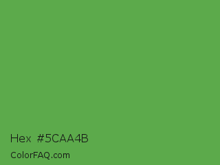 Hex #5caa4b Color is a normal green color and the nearest color is Apple #4fa83d. Hex code #5caa4b and RGB value is rgb(92,170,75). In RGB color space, this color is composed of 36% red, 67% green, 29% blue, In CMYK color space, this color is composed of 46% cyan, 0% magenta, 56% yellow , 33% black , In HSL color space, this color has a hue angle of 109° , 39% saturation and 48% lightness.