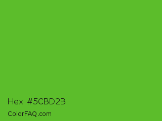 Hex #5cbd2b Color is a normal green color and the nearest color is Green RYB #66b032. Hex code #5cbd2b and RGB value is rgb(92,189,43). In RGB color space, this color is composed of 36% red, 74% green, 17% blue, In CMYK color space, this color is composed of 51% cyan, 0% magenta, 77% yellow , 26% black , In HSL color space, this color has a hue angle of 100° , 63% saturation and 45% lightness.