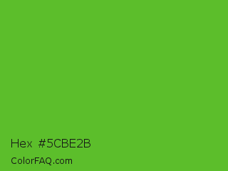 Hex #5cbe2b Color is a normal green color and the nearest color is Green RYB #66b032. Hex code #5cbe2b and RGB value is rgb(92,190,43). In RGB color space, this color is composed of 36% red, 75% green, 17% blue, In CMYK color space, this color is composed of 52% cyan, 0% magenta, 77% yellow , 25% black , In HSL color space, this color has a hue angle of 100° , 63% saturation and 46% lightness.