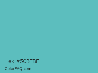 Hex #5cbebe Color is a normal cyan color and the nearest color is Fountain Blue #56b4be. Hex code #5cbebe and RGB value is rgb(92,190,190). In RGB color space, this color is composed of 36% red, 75% green, 75% blue, In CMYK color space, this color is composed of 52% cyan, 0% magenta, 0% yellow , 25% black , In HSL color space, this color has a hue angle of 180° , 43% saturation and 55% lightness.