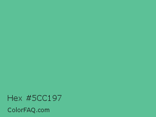 Hex #5cc197 Color is a normal green color and the nearest color is Silver Tree #66b58f. Hex code #5cc197 and RGB value is rgb(92,193,151). In RGB color space, this color is composed of 36% red, 76% green, 59% blue, In CMYK color space, this color is composed of 52% cyan, 0% magenta, 22% yellow , 24% black , In HSL color space, this color has a hue angle of 155° , 45% saturation and 56% lightness.