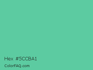 Hex #5ccba1 Color is a normal green color and the nearest color is Medium Aquamarine #66ddaa. Hex code #5ccba1 and RGB value is rgb(92,203,161). In RGB color space, this color is composed of 36% red, 80% green, 63% blue, In CMYK color space, this color is composed of 55% cyan, 0% magenta, 21% yellow , 20% black , In HSL color space, this color has a hue angle of 157° , 52% saturation and 58% lightness.