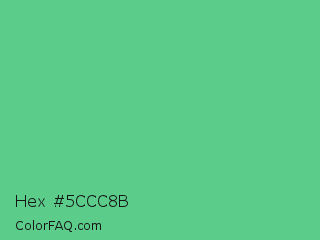 Hex #5ccc8b Color is a normal green color and the nearest color is Emerald #50c878. Hex code #5ccc8b and RGB value is rgb(92,204,139). In RGB color space, this color is composed of 36% red, 80% green, 55% blue, In CMYK color space, this color is composed of 55% cyan, 0% magenta, 32% yellow , 20% black , In HSL color space, this color has a hue angle of 145° , 52% saturation and 58% lightness.