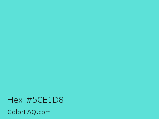 Hex #5ce1d8 Color is a light cyan color and the nearest color is Viking #64ccdb. Hex code #5ce1d8 and RGB value is rgb(92,225,216). In RGB color space, this color is composed of 36% red, 88% green, 85% blue, In CMYK color space, this color is composed of 59% cyan, 0% magenta, 4% yellow , 12% black , In HSL color space, this color has a hue angle of 176° , 69% saturation and 62% lightness.