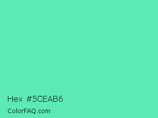 Hex #5ceab6 Color is a light green color and the nearest color is Medium Aquamarine #66ddaa. Hex code #5ceab6 and RGB value is rgb(92,234,182). In RGB color space, this color is composed of 36% red, 92% green, 71% blue, In CMYK color space, this color is composed of 61% cyan, 0% magenta, 22% yellow , 8% black , In HSL color space, this color has a hue angle of 158° , 77% saturation and 64% lightness.