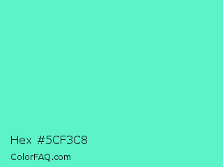 Hex #5cf3c8 Color is a light green color and the nearest color is Turquoise #40e0d0. Hex code #5cf3c8 and RGB value is rgb(92,243,200). In RGB color space, this color is composed of 36% red, 95% green, 78% blue, In CMYK color space, this color is composed of 62% cyan, 0% magenta, 18% yellow , 5% black , In HSL color space, this color has a hue angle of 163° , 86% saturation and 66% lightness.