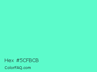 Hex #5cfbcb Color is a light green color and the nearest color is Aquamarine #7fffd4. Hex code #5cfbcb and RGB value is rgb(92,251,203). In RGB color space, this color is composed of 36% red, 98% green, 80% blue, In CMYK color space, this color is composed of 63% cyan, 0% magenta, 19% yellow , 2% black , In HSL color space, this color has a hue angle of 162° , 95% saturation and 67% lightness.