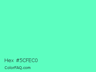 Hex #5cfec0 Color is a light green color and the nearest color is Aquamarine #7fffd4. Hex code #5cfec0 and RGB value is rgb(92,254,192). In RGB color space, this color is composed of 36% red, 100% green, 75% blue, In CMYK color space, this color is composed of 64% cyan, 0% magenta, 24% yellow , 0% black , In HSL color space, this color has a hue angle of 157° , 99% saturation and 68% lightness.