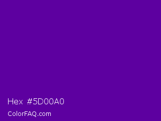 Hex #5d00a0 Color is a normal purple color and the nearest color is Purple #660099. Hex code #5d00a0 and RGB value is rgb(93,0,160). In RGB color space, this color is composed of 36% red, 0% green, 63% blue, In CMYK color space, this color is composed of 42% cyan, 100% magenta, 0% yellow , 37% black , In HSL color space, this color has a hue angle of 275° , 100% saturation and 31% lightness.