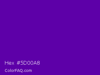 Hex #5d00a8 Color is a normal purple color and the nearest color is Purple #660099. Hex code #5d00a8 and RGB value is rgb(93,0,168). In RGB color space, this color is composed of 36% red, 0% green, 66% blue, In CMYK color space, this color is composed of 45% cyan, 100% magenta, 0% yellow , 34% black , In HSL color space, this color has a hue angle of 273° , 100% saturation and 33% lightness.