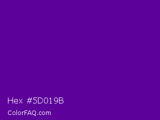 Hex #5d019b Color is a normal purple color and the nearest color is Purple #660099. Hex code #5d019b and RGB value is rgb(93,1,155). In RGB color space, this color is composed of 36% red, 0% green, 61% blue, In CMYK color space, this color is composed of 40% cyan, 99% magenta, 0% yellow , 39% black , In HSL color space, this color has a hue angle of 276° , 99% saturation and 31% lightness.