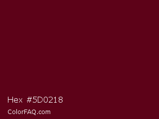 Hex #5d0218 Color is a very dark red color and the nearest color is Dark Scarlet #560319. Hex code #5d0218 and RGB value is rgb(93,2,24). In RGB color space, this color is composed of 36% red, 1% green, 9% blue, In CMYK color space, this color is composed of 0% cyan, 98% magenta, 74% yellow , 64% black , In HSL color space, this color has a hue angle of 345° , 96% saturation and 19% lightness.