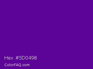 Hex #5d0498 Color is a normal purple color and the nearest color is Purple #660099. Hex code #5d0498 and RGB value is rgb(93,4,152). In RGB color space, this color is composed of 36% red, 2% green, 60% blue, In CMYK color space, this color is composed of 39% cyan, 97% magenta, 0% yellow , 40% black , In HSL color space, this color has a hue angle of 276° , 95% saturation and 31% lightness.