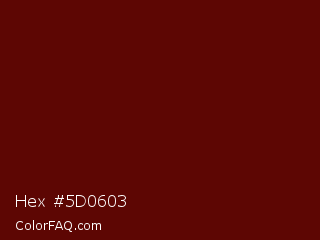 Hex #5d0603 Color is a very dark red color and the nearest color is Rosewood #65000b. Hex code #5d0603 and RGB value is rgb(93,6,3). In RGB color space, this color is composed of 36% red, 2% green, 1% blue, In CMYK color space, this color is composed of 0% cyan, 94% magenta, 97% yellow , 64% black , In HSL color space, this color has a hue angle of 2° , 94% saturation and 19% lightness.