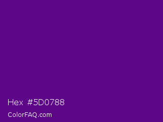 Hex #5d0788 Color is a dark purple color and the nearest color is Pigment Indigo #4b0082. Hex code #5d0788 and RGB value is rgb(93,7,136). In RGB color space, this color is composed of 36% red, 3% green, 53% blue, In CMYK color space, this color is composed of 32% cyan, 95% magenta, 0% yellow , 47% black , In HSL color space, this color has a hue angle of 280° , 90% saturation and 28% lightness.