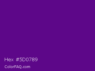 Hex #5d0789 Color is a dark purple color and the nearest color is Purple #660099. Hex code #5d0789 and RGB value is rgb(93,7,137). In RGB color space, this color is composed of 36% red, 3% green, 54% blue, In CMYK color space, this color is composed of 32% cyan, 95% magenta, 0% yellow , 46% black , In HSL color space, this color has a hue angle of 280° , 90% saturation and 28% lightness.