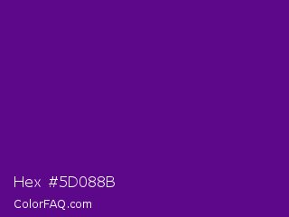 Hex #5d088b Color is a dark purple color and the nearest color is Purple #660099. Hex code #5d088b and RGB value is rgb(93,8,139). In RGB color space, this color is composed of 36% red, 3% green, 55% blue, In CMYK color space, this color is composed of 33% cyan, 94% magenta, 0% yellow , 45% black , In HSL color space, this color has a hue angle of 279° , 89% saturation and 29% lightness.