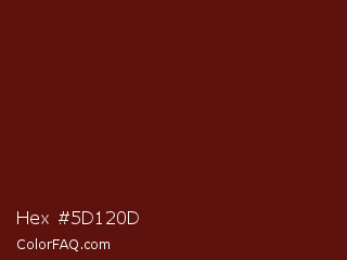 Hex #5d120d Color is a very dark red color and the nearest color is Dark Tan #661010. Hex code #5d120d and RGB value is rgb(93,18,13). In RGB color space, this color is composed of 36% red, 7% green, 5% blue, In CMYK color space, this color is composed of 0% cyan, 81% magenta, 86% yellow , 64% black , In HSL color space, this color has a hue angle of 4° , 75% saturation and 21% lightness.