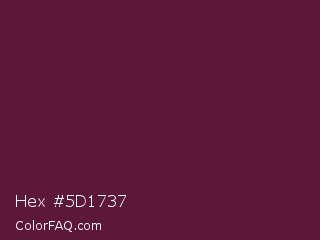 Hex #5d1737 Color is a dark rose color and the nearest color is Wine Berry #591d35. Hex code #5d1737 and RGB value is rgb(93,23,55). In RGB color space, this color is composed of 36% red, 9% green, 22% blue, In CMYK color space, this color is composed of 0% cyan, 75% magenta, 41% yellow , 64% black , In HSL color space, this color has a hue angle of 333° , 60% saturation and 23% lightness.