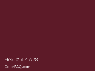 Hex #5d1a28 Color is a dark red color and the nearest color is Wine Berry #591d35. Hex code #5d1a28 and RGB value is rgb(93,26,40). In RGB color space, this color is composed of 36% red, 10% green, 16% blue, In CMYK color space, this color is composed of 0% cyan, 72% magenta, 57% yellow , 64% black , In HSL color space, this color has a hue angle of 347° , 56% saturation and 23% lightness.