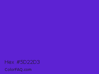 Hex #5d22d3 Color is a normal indigo color and the nearest color is Purple Heart Crayola #652dc1. Hex code #5d22d3 and RGB value is rgb(93,34,211). In RGB color space, this color is composed of 36% red, 13% green, 83% blue, In CMYK color space, this color is composed of 56% cyan, 84% magenta, 0% yellow , 17% black , In HSL color space, this color has a hue angle of 260° , 72% saturation and 48% lightness.