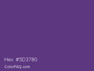 Hex #5d3780 Color is a normal purple color and the nearest color is Cyber Grape #58427c. Hex code #5d3780 and RGB value is rgb(93,55,128). In RGB color space, this color is composed of 36% red, 22% green, 50% blue, In CMYK color space, this color is composed of 27% cyan, 57% magenta, 0% yellow , 50% black , In HSL color space, this color has a hue angle of 271° , 40% saturation and 36% lightness.