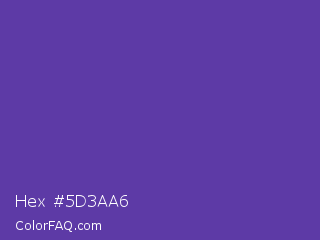 Hex #5d3aa6 Color is a normal indigo color and the nearest color is Royal Purple #6b3fa0. Hex code #5d3aa6 and RGB value is rgb(93,58,166). In RGB color space, this color is composed of 36% red, 23% green, 65% blue, In CMYK color space, this color is composed of 44% cyan, 65% magenta, 0% yellow , 35% black , In HSL color space, this color has a hue angle of 259° , 48% saturation and 44% lightness.