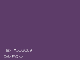 Hex #5d3c69 Color is a normal purple color and the nearest color is Imperial #602f6b. Hex code #5d3c69 and RGB value is rgb(93,60,105). In RGB color space, this color is composed of 36% red, 24% green, 41% blue, In CMYK color space, this color is composed of 11% cyan, 43% magenta, 0% yellow , 59% black , In HSL color space, this color has a hue angle of 284° , 27% saturation and 32% lightness.