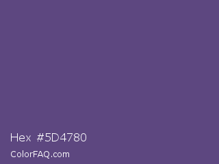 Hex #5d4780 Color is a normal violet color and the nearest color is Cyber Grape #58427c. Hex code #5d4780 and RGB value is rgb(93,71,128). In RGB color space, this color is composed of 36% red, 28% green, 50% blue, In CMYK color space, this color is composed of 27% cyan, 45% magenta, 0% yellow , 50% black , In HSL color space, this color has a hue angle of 263° , 29% saturation and 39% lightness.