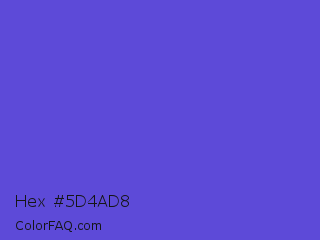 Hex #5d4ad8 Color is a normal indigo color and the nearest color is Majorelle Blue #6050dc. Hex code #5d4ad8 and RGB value is rgb(93,74,216). In RGB color space, this color is composed of 36% red, 29% green, 85% blue, In CMYK color space, this color is composed of 57% cyan, 66% magenta, 0% yellow , 15% black , In HSL color space, this color has a hue angle of 248° , 65% saturation and 57% lightness.