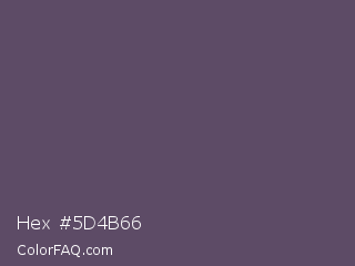Hex #5d4b66 Color is a normal purple color and the nearest color is Scarpa Flow #585562. Hex code #5d4b66 and RGB value is rgb(93,75,102). In RGB color space, this color is composed of 36% red, 29% green, 40% blue, In CMYK color space, this color is composed of 9% cyan, 26% magenta, 0% yellow , 60% black , In HSL color space, this color has a hue angle of 280° , 15% saturation and 35% lightness.