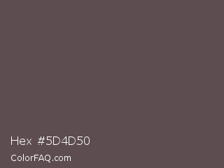 Hex #5d4d50 Color is a normal red color and the nearest color is Don Juan #5d4c51. Hex code #5d4d50 and RGB value is rgb(93,77,80). In RGB color space, this color is composed of 36% red, 30% green, 31% blue, In CMYK color space, this color is composed of 0% cyan, 17% magenta, 14% yellow , 64% black , In HSL color space, this color has a hue angle of 349° , 9% saturation and 33% lightness.