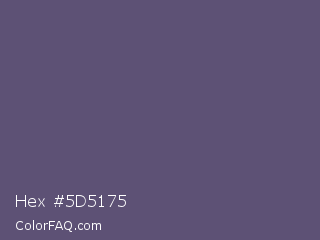 Hex #5d5175 Color is a normal indigo color and the nearest color is Smoky #605b73. Hex code #5d5175 and RGB value is rgb(93,81,117). In RGB color space, this color is composed of 36% red, 32% green, 46% blue, In CMYK color space, this color is composed of 21% cyan, 31% magenta, 0% yellow , 54% black , In HSL color space, this color has a hue angle of 260° , 18% saturation and 39% lightness.