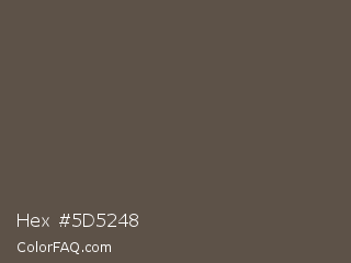Hex #5d5248 Color is a normal orange color and the nearest color is Umber #635147. Hex code #5d5248 and RGB value is rgb(93,82,72). In RGB color space, this color is composed of 36% red, 32% green, 28% blue, In CMYK color space, this color is composed of 0% cyan, 12% magenta, 23% yellow , 64% black , In HSL color space, this color has a hue angle of 29° , 13% saturation and 32% lightness.